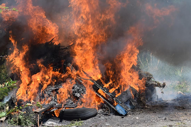 “This is our second burn for the year, the last one we did just over 2000 plants,” said, Inspector(Ag) Reynold Myers as he monitored the raging fire being tended by officers of the SSU. He added, “we will continue to search, and when we find, we will uproot, seize and burn”. It is our goal, to rid our communities illegal drugs and instruments that can be used to commit crimes.”