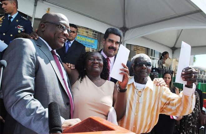 President Maduro, after a state welcome at the Robert L. Bradshaw International Airport, travelled to Basseterre’s central business district, and on South Independence Square outside CLICO Building presided in the symbolic handing over of cheques to former sugar workers. Representing the workers were Ms Vivian Hope and Mr Samuel ‘Chemical’ Wilson.