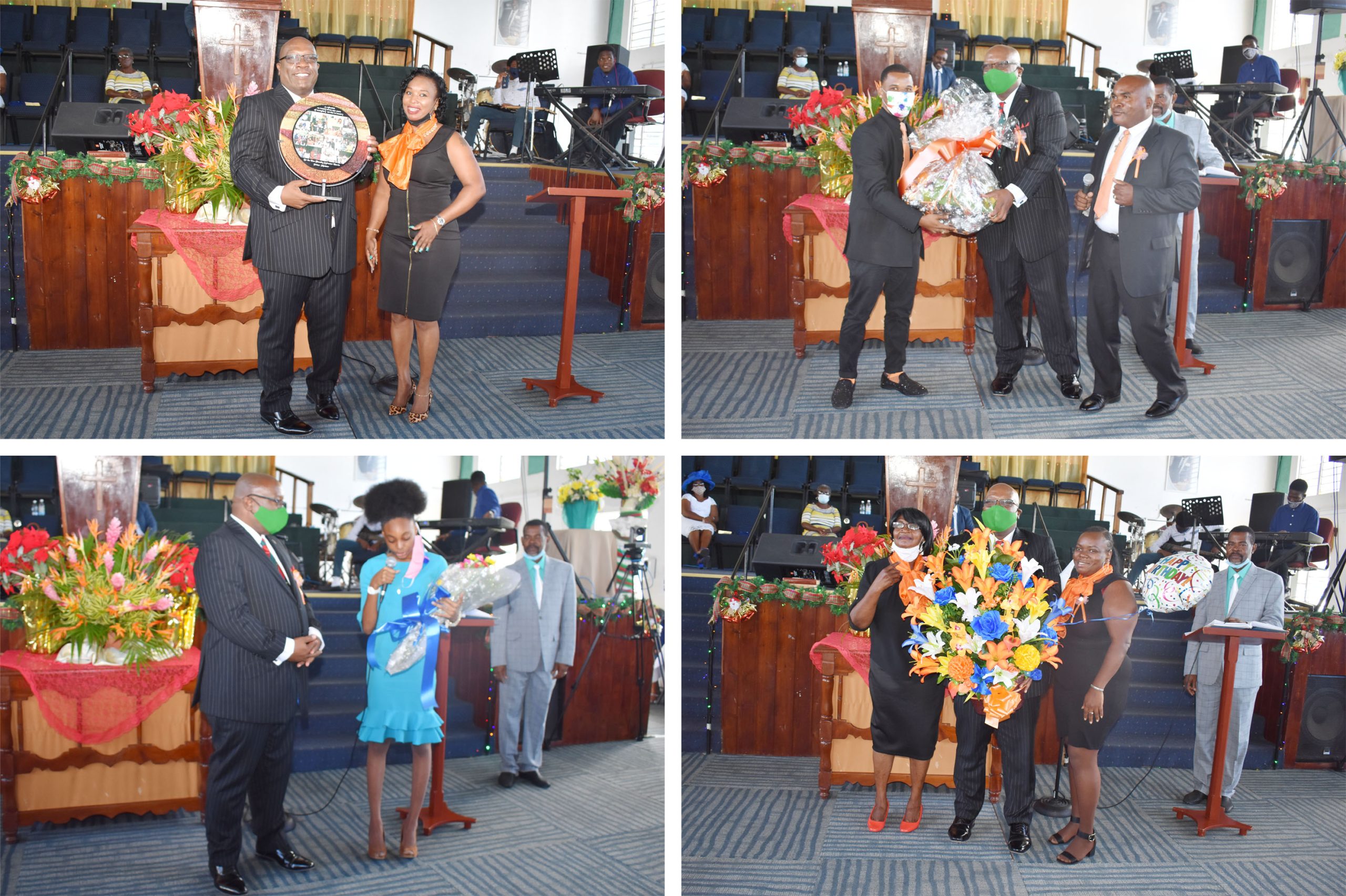 Presentations made to PM Harris: Clockwise from top, plaque by Constituency Number Seven Group, bouquet by PLP National Executive; bouquet by Constituency Number Seven Women’s Group, bouquet by Camp Ezekiel.