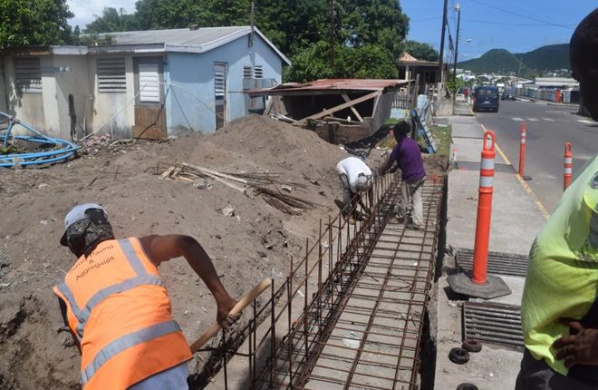 Crews from the Public Works Department (PWD) are busy repairing a section of the drain located at the corner of Pond and Sandown Road, as part of a component of a larger project that saw upgrades to the Basseterre Bay Road, Frigate Bay Road, and the Dr. Kennedy A. Simmonds Highway.