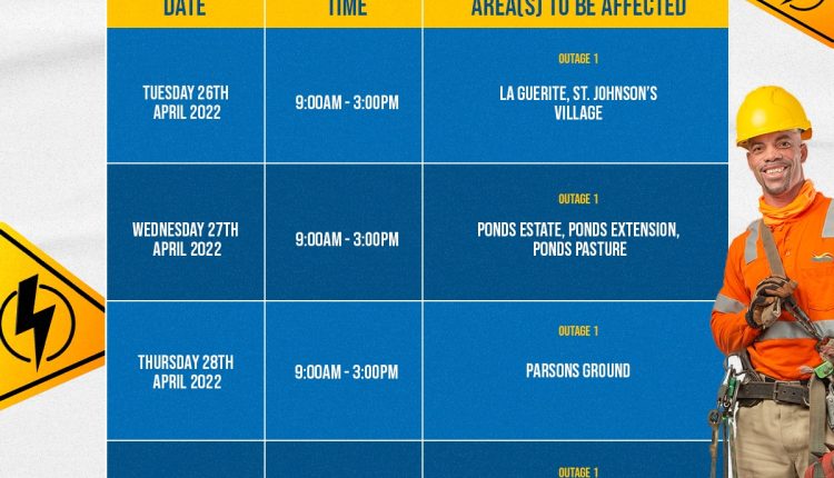 Basseterre, St. Kitts (April 22nd, 2022)—The St. Kitts Electricity Company Ltd. is advising the public of scheduled maintenance outages for the week 25th -29th April 2022. The scheduled maintenance outages are necessary to perform maintenance as a part of our ongoing efforts to improve reliability.
