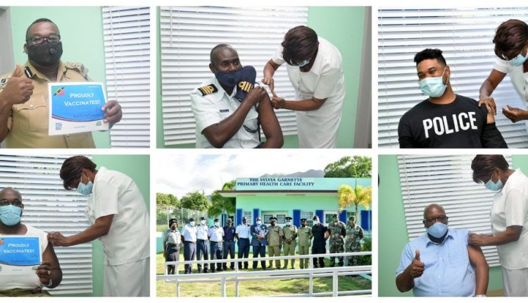 BASSETERRE, St. Kitts, May 13, 2021 (Press Unit in the Office of the Prime Minister) – As critical first responders and frontline workers, officers of the various security agencies in St. Kitts and Nevis are leading by example by rolling up their sleeves and accepting the Oxford/AstraZeneca COVID-19 vaccine.