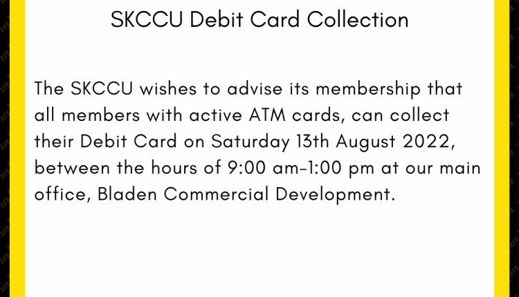 The SKCCU wishes to advise its membership that all members with active ATM cards, can collect their Debit Card on Saturday 13th August 2022, between the hours of 9:00am-1:00pm at our main office, Bladen Commercial Development.