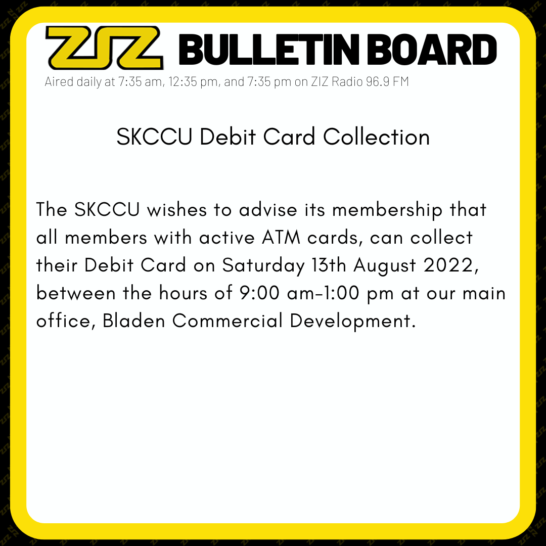 The SKCCU wishes to advise its membership that all members with active ATM cards, can collect their Debit Card on Saturday 13th August 2022, between the hours of 9:00am-1:00pm at our main office, Bladen Commercial Development.