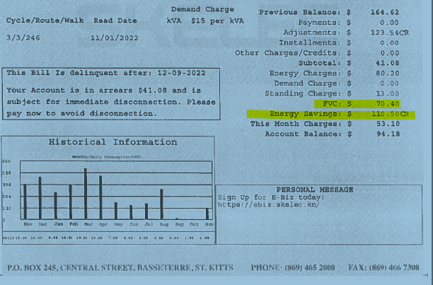 The change to the bill will include the value of the Fuel Variation Charge monthly and a credit of the same amount. The FVC savings will be seen in the section of the bill marked Energy Savings. Although the charge will now appear on the bill, customers will not see an increase in their bill, and customers will only pay the usual charges. The Fuel Variation Charge is currently being subsidized by the Government of St. Kitts and Nevis. The subsidy provides relief to SKELEC customers and prevents an increase in their individual bills.