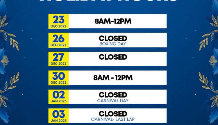 Basseterre, St. Kitts, December 20, 2022 (SKELEC)—The St. Kitts Electricity Company Ltd. wishes to inform the public that its offices will close half day on Friday 23rd December and Friday 30th December 2022 in observance of Christmas Eve and New Year’s Eve. The offices will be closed on the 26th and 27th of December 2022 and reopen on the 28th of December. The offices will be closed on the 2nd and 3rd of January 2023 and reopen 4th of January 2023 respectively.