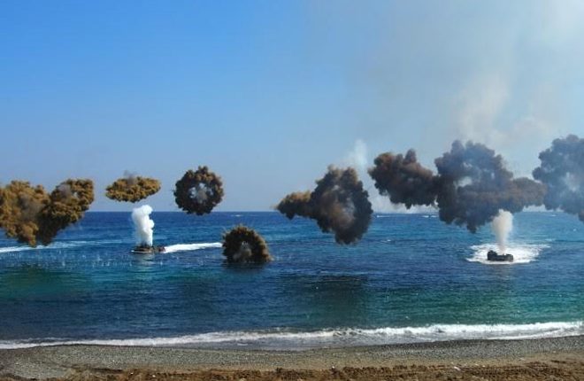 Pohang, South Korea (CNN)– Amid blasts of explosives and camouflaging smoke, U.S. and South Korean marines and sailors stormed a beach aboard assault vehicles Saturday in a mock amphibious landing.