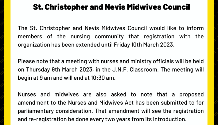 The St. Christopher and Nevis Midwives Council would like to inform members of the nursing community that registration with the organization has been extended until Friday 10th March 2023.