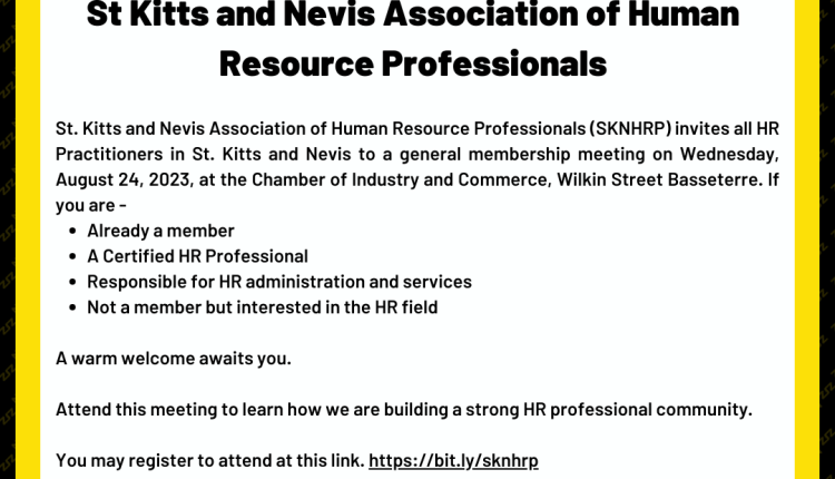 The St. Kitts and Nevis Association of Human Resource Professionals (SKNHRP) invites all HR Practitioners in St. Kitts and Nevis to a general membership meeting on Wednesday, August 24, 2023, at the Chamber of Industry and Commerce, Wilkin Street Basseterre. If you are –