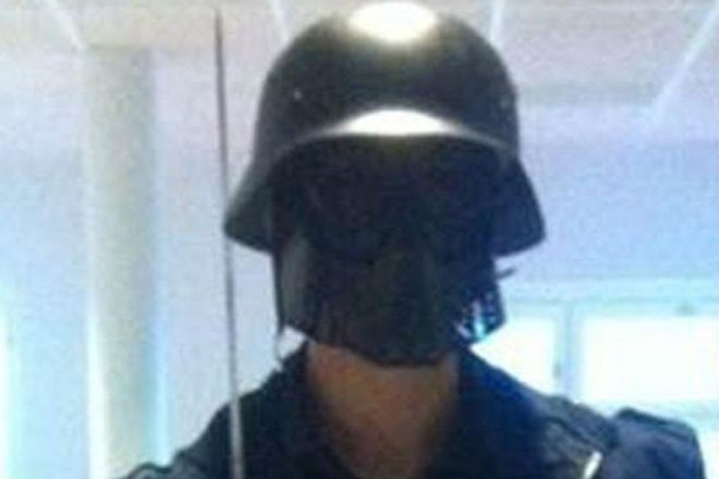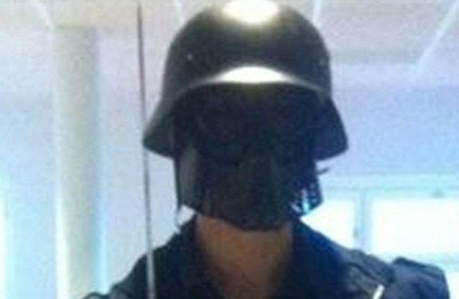 It shows a man wearing black, with a helmet, a mask and a sword, possibly resembling a Nazi World War Two uniform.