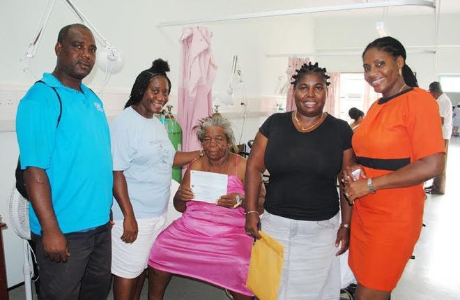 Like all those who had applied, she learnt that she had qualified but she could not come to Basseterre to collect the cheque as she had taken ill and warded at the JNF General Hospital. She was in the company of her daughter Ms Cecile Burt and son-in-law Mr Colville Francis when the cheque was handed over to her by her bedside.