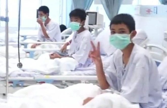 The first footage has emerged from the hospital where 12 Thai boys and their coach are being treated after their dramatic rescue from a flooded cave.