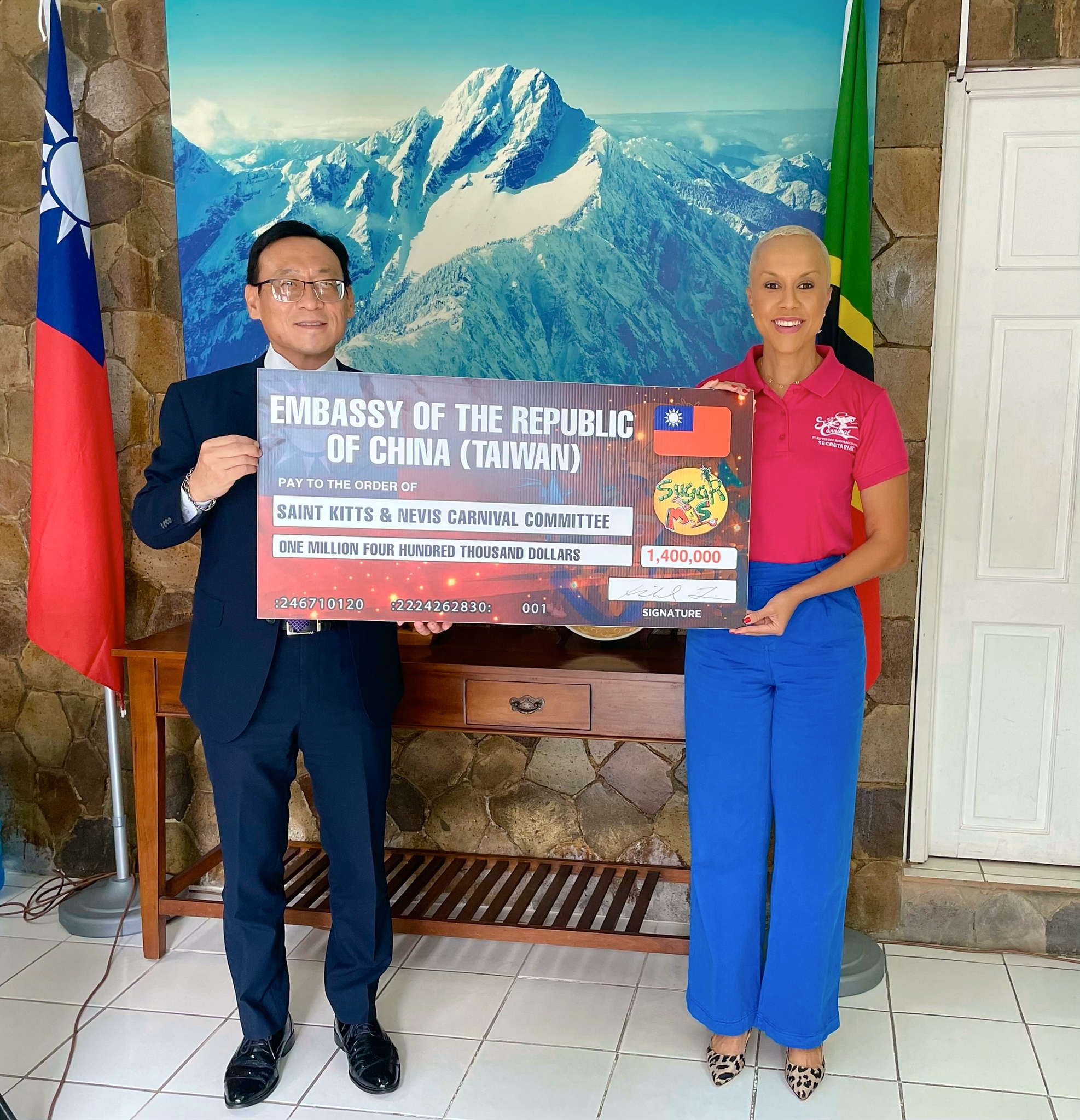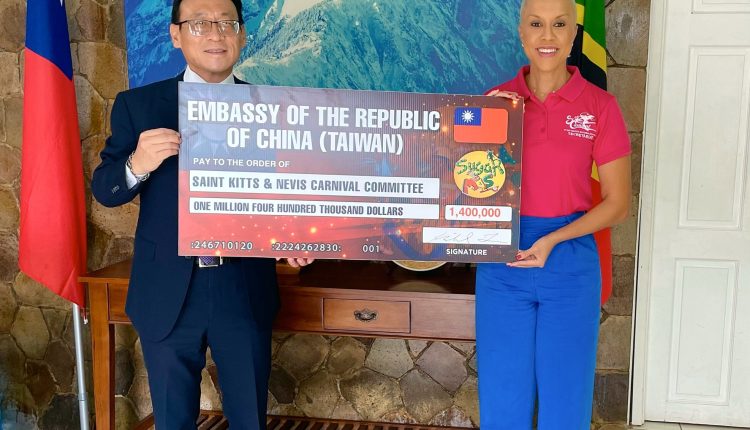 Basseterre, St. Kitts, December 20, 2022 (SKNNCC) — In an impressive ceremony on Monday 19 December, The Embassy of The Republic of China (Taiwan) was declared the Double Diamond sponsor of Sugar Mas 51. Ambassador Michael Chau-Horng Lin presented a cheque in the amount of EC$1.4 Million to the Chairperson of the St Kitts Nevis National Carnival Committee (SKNNCC), Shannon Hawley.