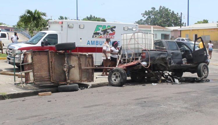 According to a police source the incident occurred at about 11:20 am on Sunday and involved a motor car PB 904 driven by Clive Nias of West Farm Estate and a pick-up truck P2641 driven by Wingrove Vaughn of Lower Monkey Hill.