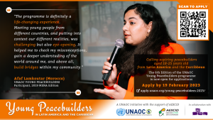 January 17, 2023 (UNAOC) — The United Nations Alliance of Civilizations (UNAOC) is launching the call for applications for the 2023 edition of its Young Peacebuilders programme, which for the second time will focus on Latin America and the Caribbean. The call is open to participants between 18 and 25 years old from the region, with a strong interest in growing their ability to act as agents of peace in their respective communities, preventing violent extremism through intercultural and interfaith dialogue.