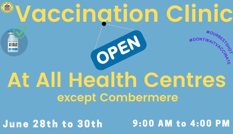 With the exception of Combermere, health centres on Nevis will be administering vaccines from 9 a.m. to 4 p.m. on June 30.