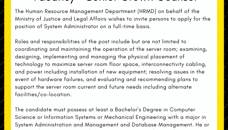 The Human Resource Management Department (HRMD) on behalf of the Ministry of Justice and Legal Affairs wishes to invite persons to apply for the position of System Administrator on a full-time basis.