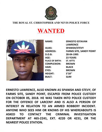 According to a wanted poster issued on Monday, 23 year old Ernesto Lawrence, also known as Spanish and Stevy, of Farms Site, Sandy Point, escaped from police custody on October 05, 2018.