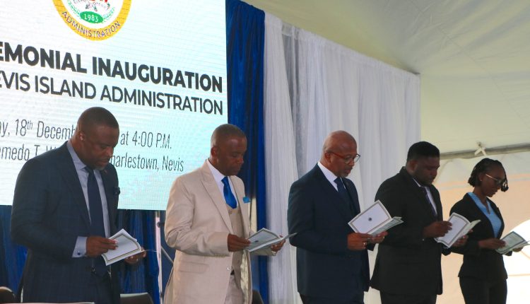 Having won a three-seat majority at the December 12, 2022, Nevis Island Assembly election, the three elected Members along with two nominated Members were sworn in as NIA Cabinet Ministers at Sunday’s ceremony, held at the Elquemedo T. Willett Park in Charlestown.