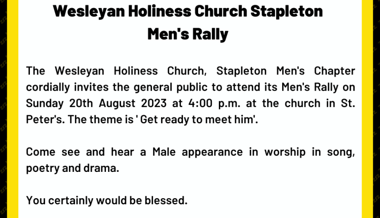 The Wesleyan Holiness Church, Stapleton Men’s Chapter cordially invites the general public to attend its Men’s Rally on Sunday 20th August 2023 at 4:00 p.m at the church in St. Peter’s.  The theme is ‘ Get ready to meet him’.