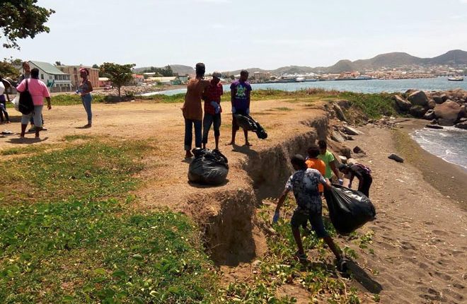 (SKNIS): Prospective group leaders for the Department of Youth Empowerment’s 33rd Annual Summer Residential Camp lived up to the theme: “Team Work Makes the Dream Work” when they spent hours on Saturday (June 18) cleaning up the Bay Front in Basseterre.