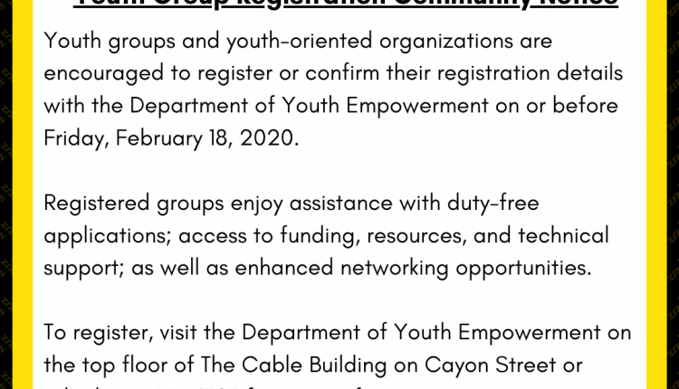 Youth groups and youth-oriented organizations are encouraged to register or confirm their registration details with the Department of Youth Empowerment on or before Friday, February 18, 2020.