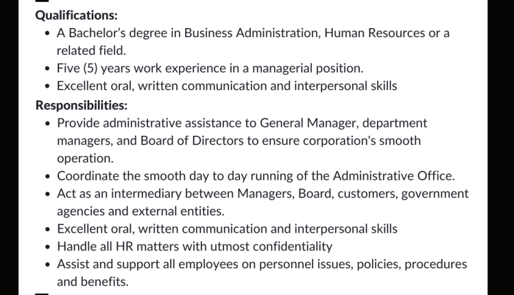 Provide administrative assistance to the General Manager, department managers and the Board of Directors as well as ensuring the smooth operation of the corporation.