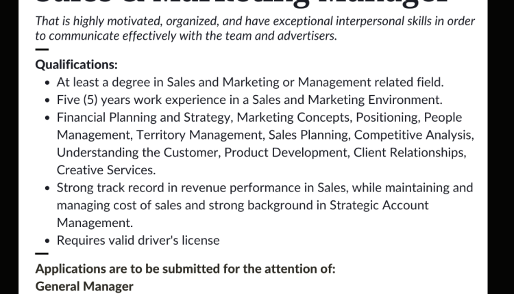 –Five (5) years work experience in a Sales and Marketing Environment.
