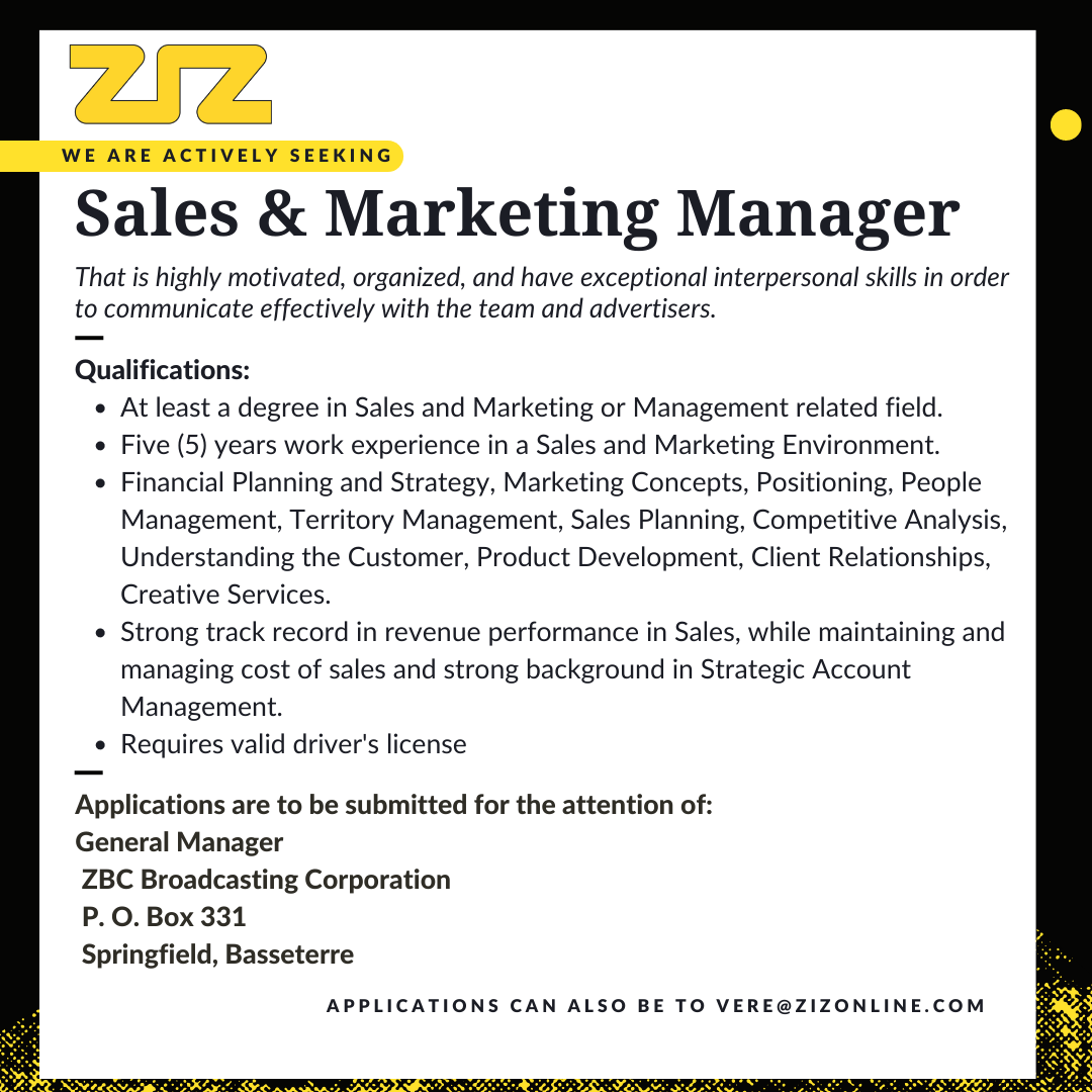 ZBC is seeking a suitably qualified person to fill the position of Sales and Marketing Manager